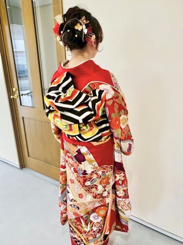 こちらのお客様は、お手持ちの古典柄の振袖に合わせて小物をコーディネートしていただきました。