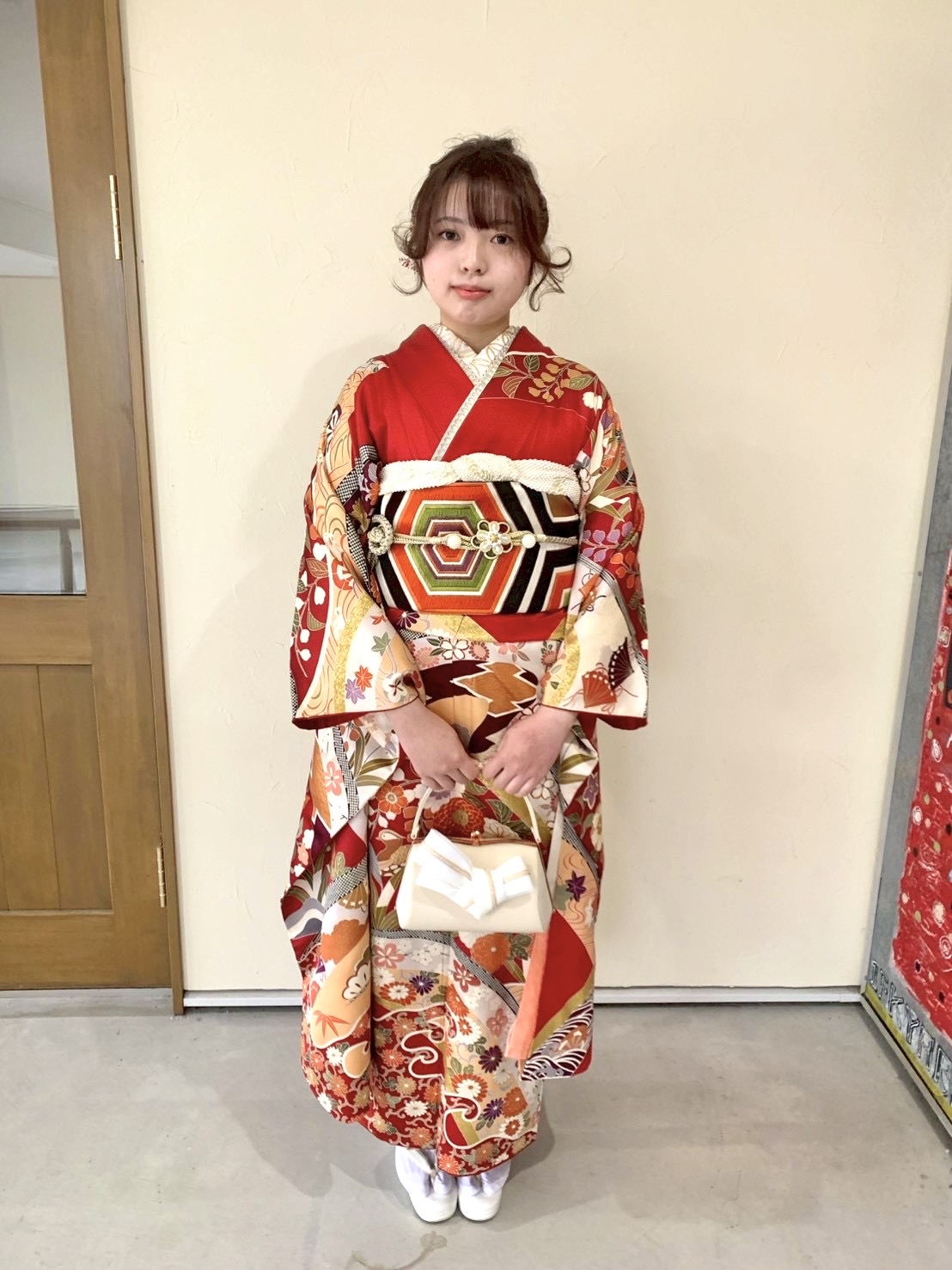 赤い古典柄の振袖に、いま流行りの白系くすみカラーを合わせることによって一気に垢抜け♡